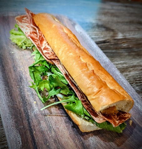 Baguette with vegan pâté (contains nuts), garlic aioli sauce, vegan bacon, hash brown, pickled carrots & daikon, cucumber, spring mix, lettuce, and chopped parsley.