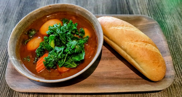 Vegan meatballs, potatoes, carrots, and kale. Topped with cilantro. Served on a french baguette.