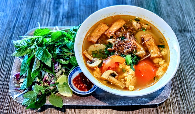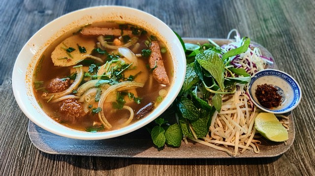 Rice noodles with tomato-based soup, tofu paste, mushroom, water spinach, vegan ham, tofu, and green onions. Topped with fried onions and cilantro.