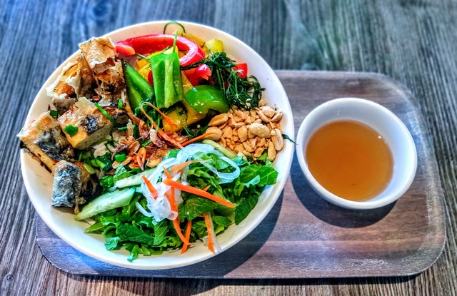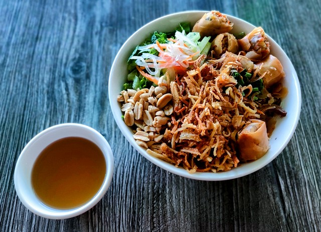 Vermicelli noodle with egg rolls, shredded vegan pork (combination of taro, tofu, jicama), green onions, fried onions, bean sprout, cucumbers, shredded lettuce, and mint leaves. Topped with pickled carrots, daikon and peanuts. Served with vegan fish sauce.