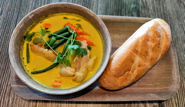 Creamy coconut curry with shredded vegan chicken, tofu, potatoes, carrots, and green beans. Topped with cilantro. Served with choice of rice or baguette.