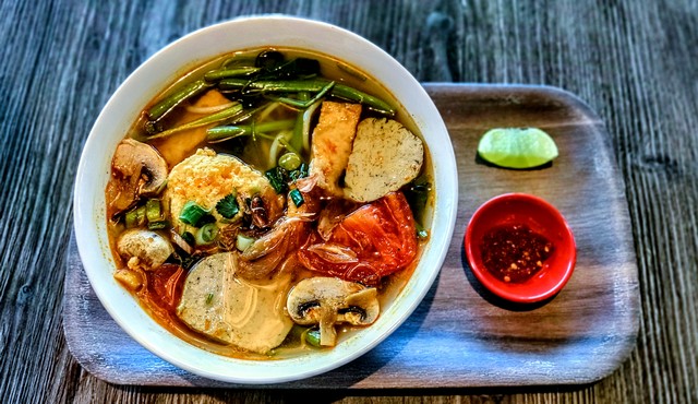 Our tomato-based noodle soup with vermicelli noodles, tomatoes, tofu paste, mushroom, tofu, green onions, fried onions, and topped with cilantro.