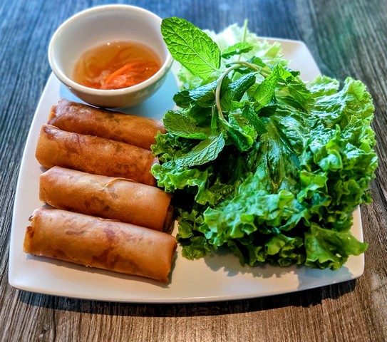 Hand-rolled with taro, impossible beef, mung bean, carrots, glass noodle, and mushrooms. Served with lettuce, fresh herbs, and vegan fish sauce.
