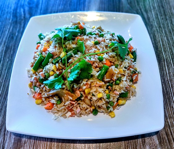 White rice with vegan bacon, green peas, carrots, tofu, vegan chicken, cilantro and green onions. [GF option available]