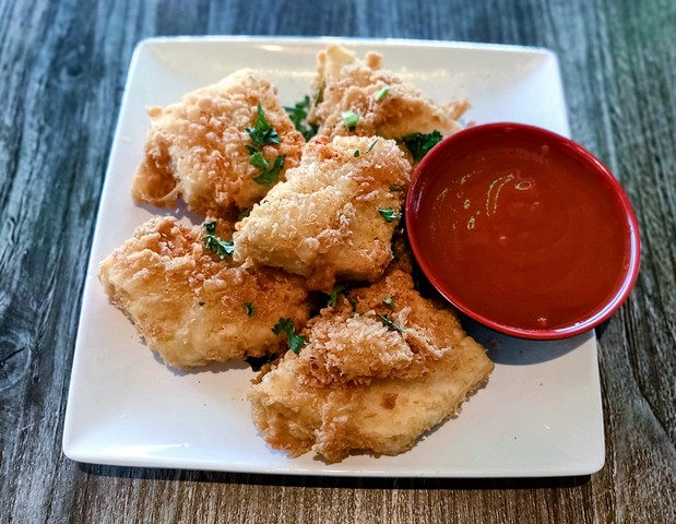 House-battered soft tofu pieces, deep fried, topped with peppers & chopped parsley. Served with house-made plum sauce.