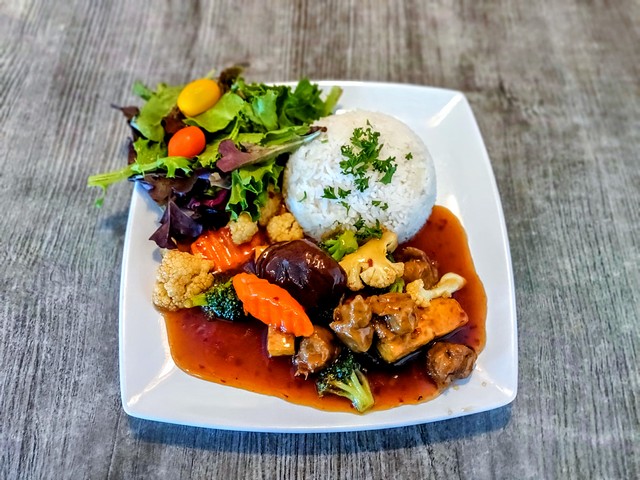 Vegan beef, broccoli, cauliflower, carrots, mushrooms, and tofu stir fried with our General Tso sauce. Served with white rice and spring mix.