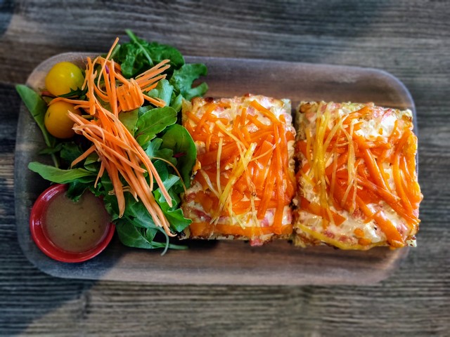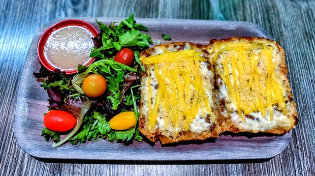 Ciabatta bread topped with vegan ham, vegan mayo, grilled onions, and melted vegan cheddar and parmesan. Served with a side salad.