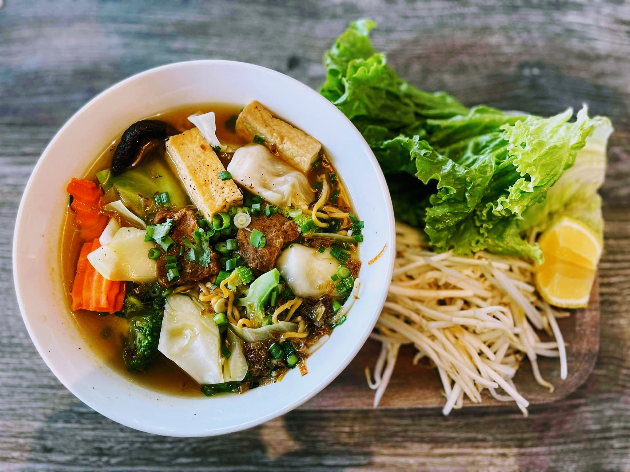 Vegan beef strips, vegan meatballs, tofu, mushroom, scallions, onions, cilantro, and rice noodle in our house-made pho broth.