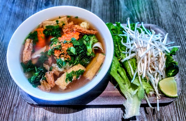 Vegan beef strips, Vietnamese vegan ham, vegan meatballs, tofu, scallions, cilantro, mushrooms, onions, and rice noodle in our house-made broth.