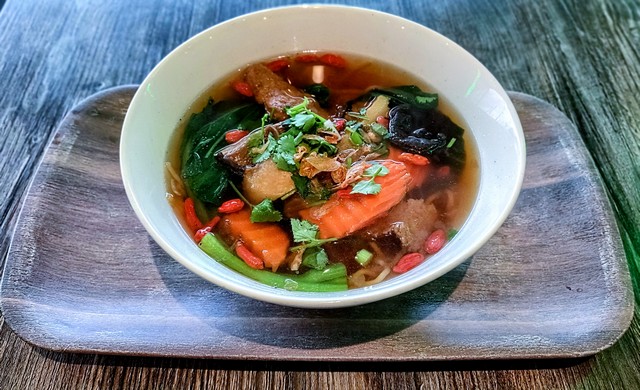 Yellow noodles, mushroom, bok choy, duckless meat, carrots, and goji berries in our house-made herbal soup broth.