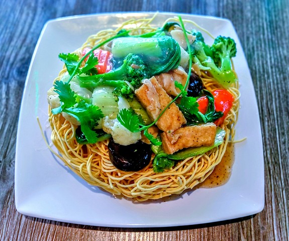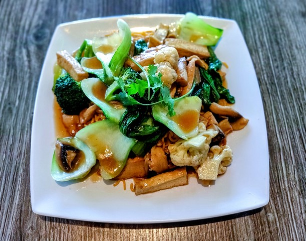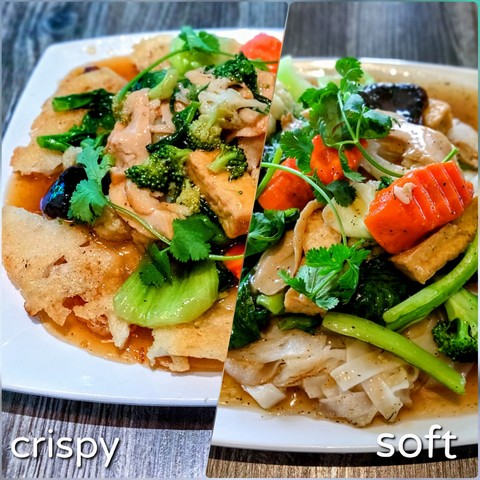 Choice of crispy or soft noodle. Rice noodle dish with vegan chicken, tofu, green onions, broccoli, bok choy, carrots, Chinese spinach, mushroom, and vegan oyster sauce. [GF option available]