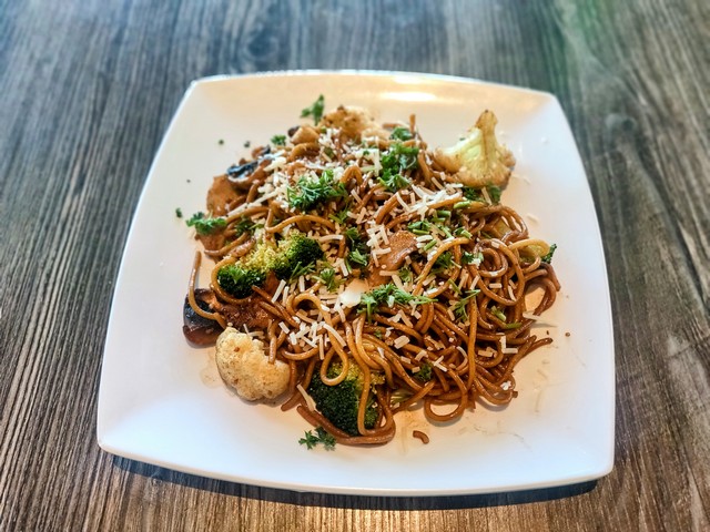 Yellow noodles stir fried with vegan chicken, mushroom, and broccoli. Topped with vegan parmesan and parsley.