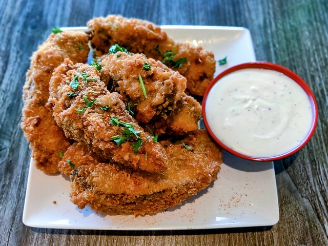 House-battered and breaded portobello mushrooms, deep fried, topped with peppers & chopped parsley. Served with garlic aoli sauce.