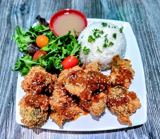 Breaded cauliflower with house-made orange sauce. Served with white rice and side salad.