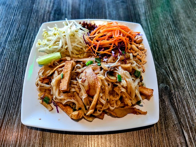 Rice noodle, mushroom, fried tofu, vegan chicken, and house-made sauce. Served with steamed bean sprout, carrots, peanuts and lime.
